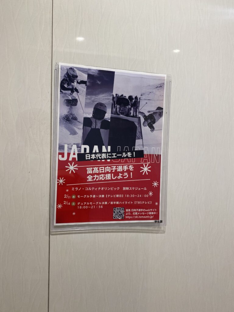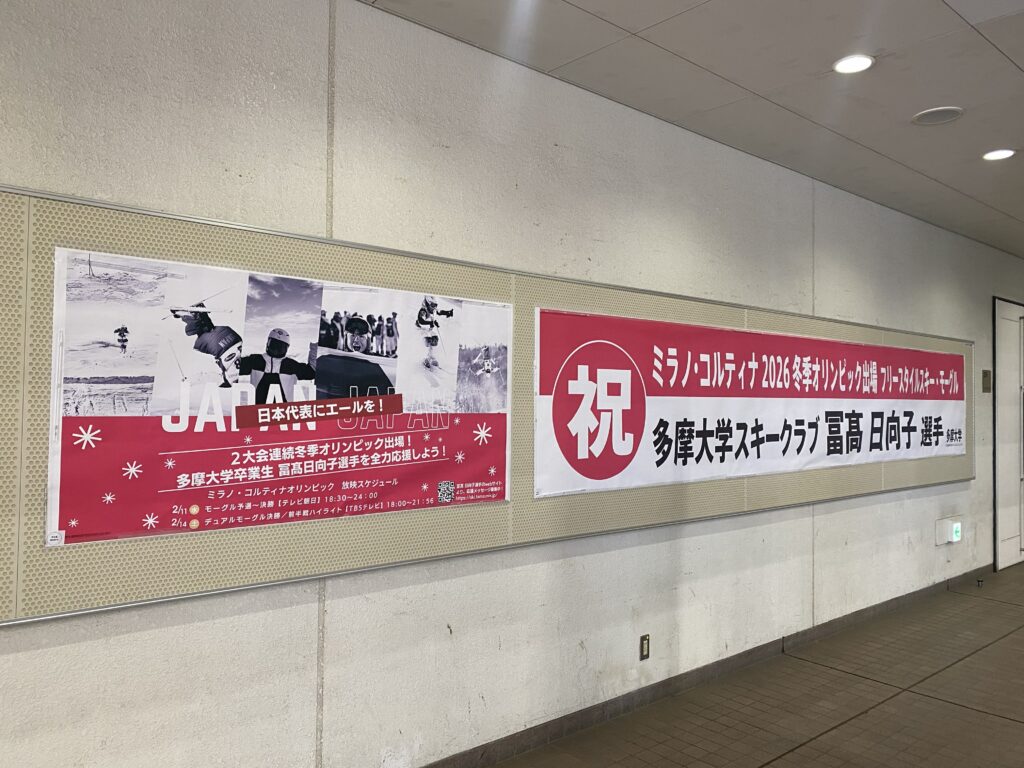 冨髙選手に対し、オリンピックでの活躍を祈念し、多摩大学教職員および学生から募った多数の応援の寄せ書きが書かれた日本国旗の贈呈を行い、学内に掲示している応援ブースや応援ポスターについても写真にて共有した。