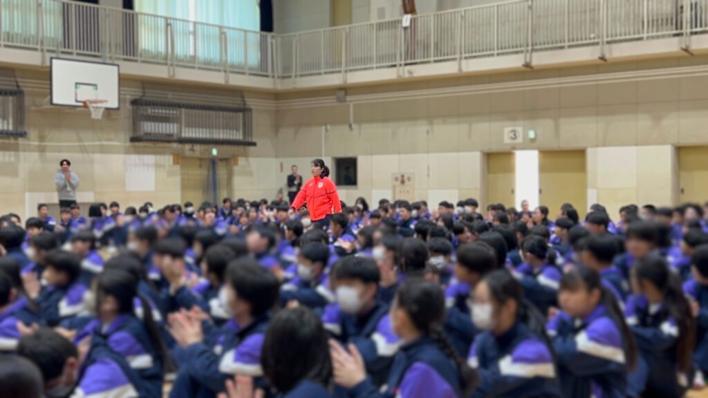 2026年3月5日、多摩大学スキークラブの冨髙日向子選手が、母校である町田市立金井中学校を訪問しました。体育館には生徒と教職員が集まり、朝礼の時間を利用してトークセッションが行われました。