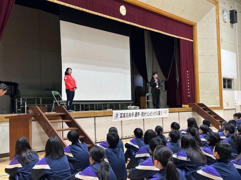 会場のスクリーンには、ミラノ・コルティナ2026冬季オリンピックでの競技映像が映し出され、世界の舞台で滑る冨髙選手の姿を、生徒たちは食い入るように見つめていました。